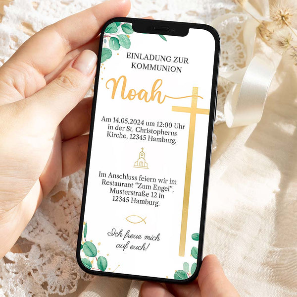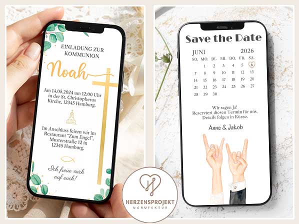 Ob zur Kommunion oder zur Hochzeit. Entdecke hier unsere liebevoll gestalteten Einladungen zum Versand über WhatsApp.