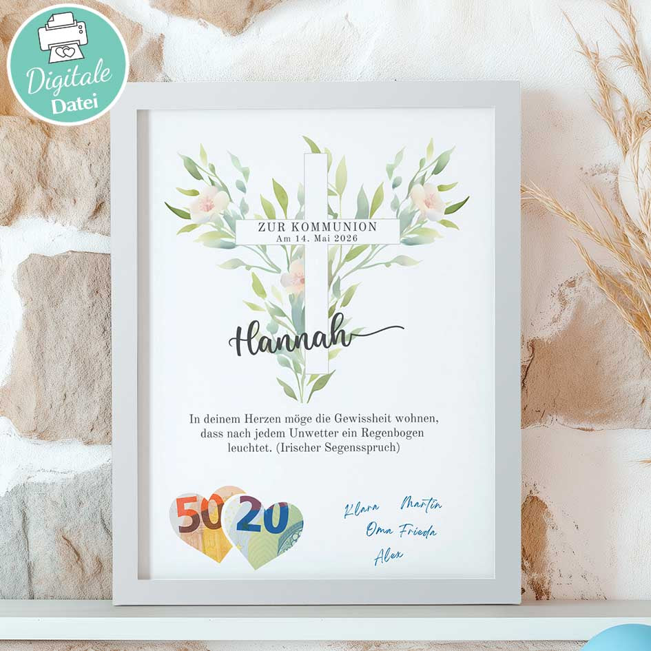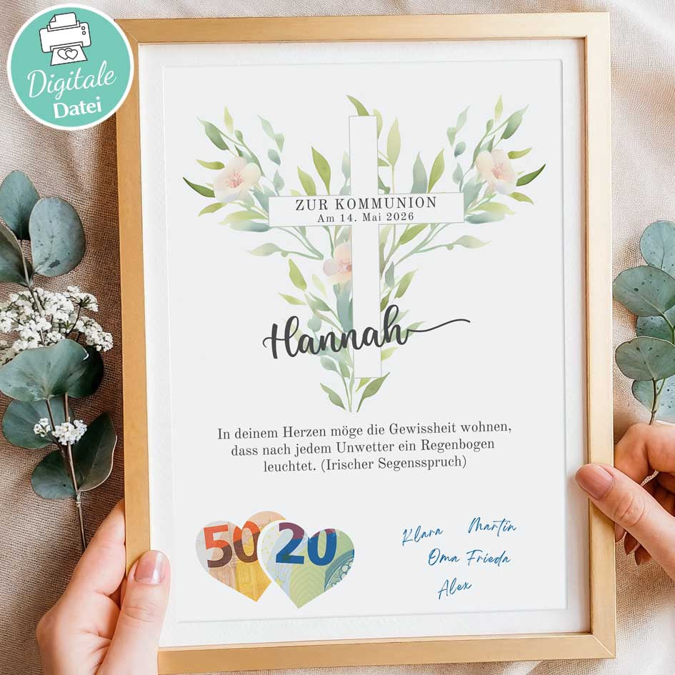 Dieses Geldgeschenk zur Kommunion ist eine moderne, stilvolle Art, Glückwünsche und Segen zu überbringen. Mit dem filigranen Kreuz, den sanften Blumenmotiven und deinem persönlichen Text entsteht ein Geschenk, das Herz und Bedeutung verbindet.