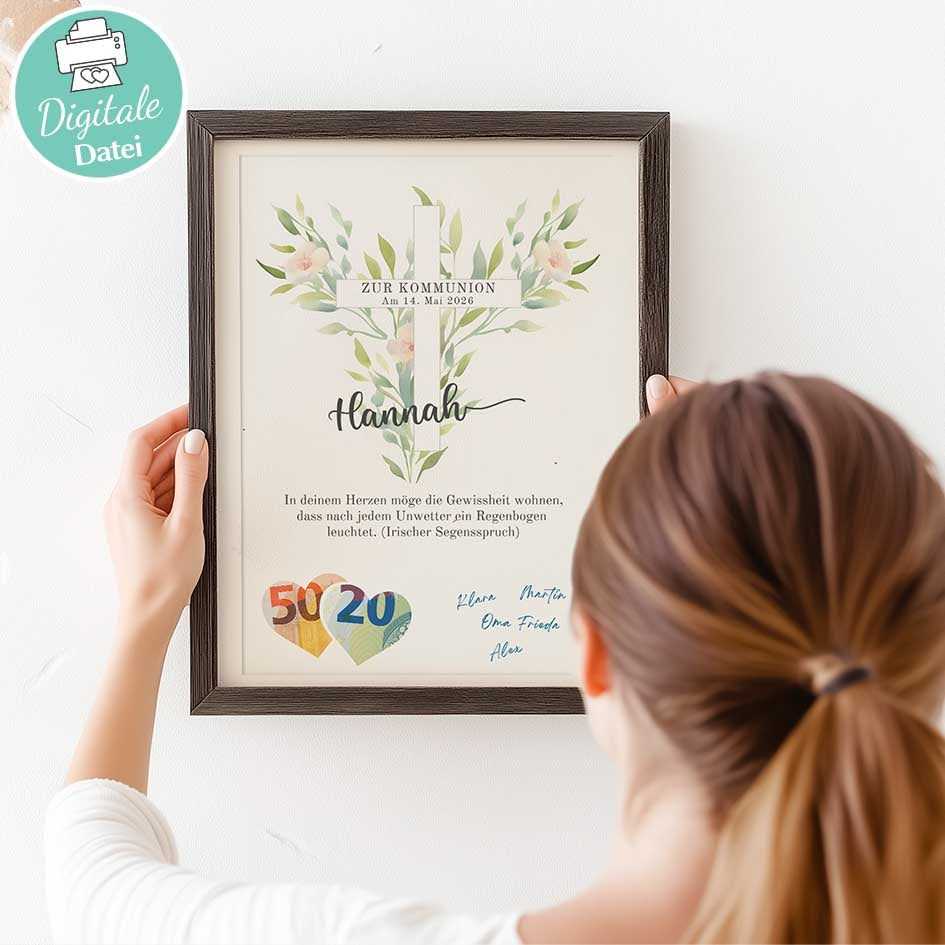- 💶 Nach dem Ausschneiden der durch Schneidelinien gekennzeichneten Bereiche kannst du einen Geldbetrag dahinterlegen. Das fertige Poster passt perfekt in jeden handelsüblichen Bilderrahmen und ist ein liebevolles, symbolisches Geschenk zur Kommunion. ✝️