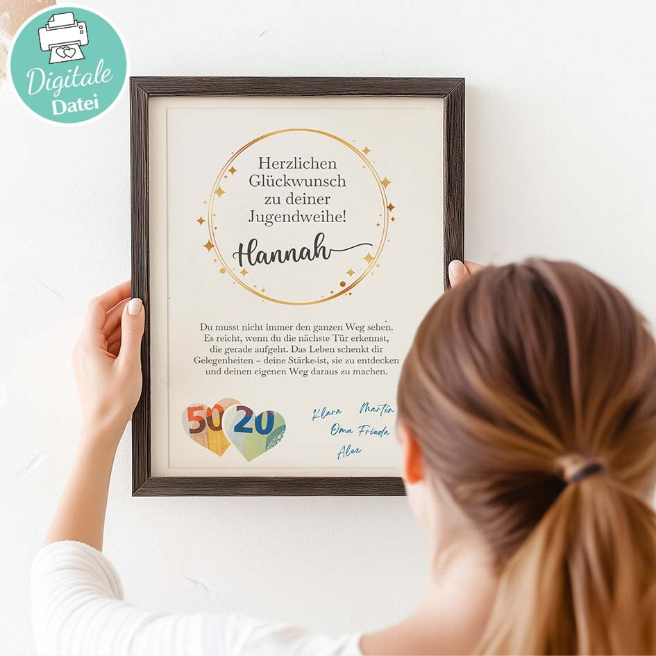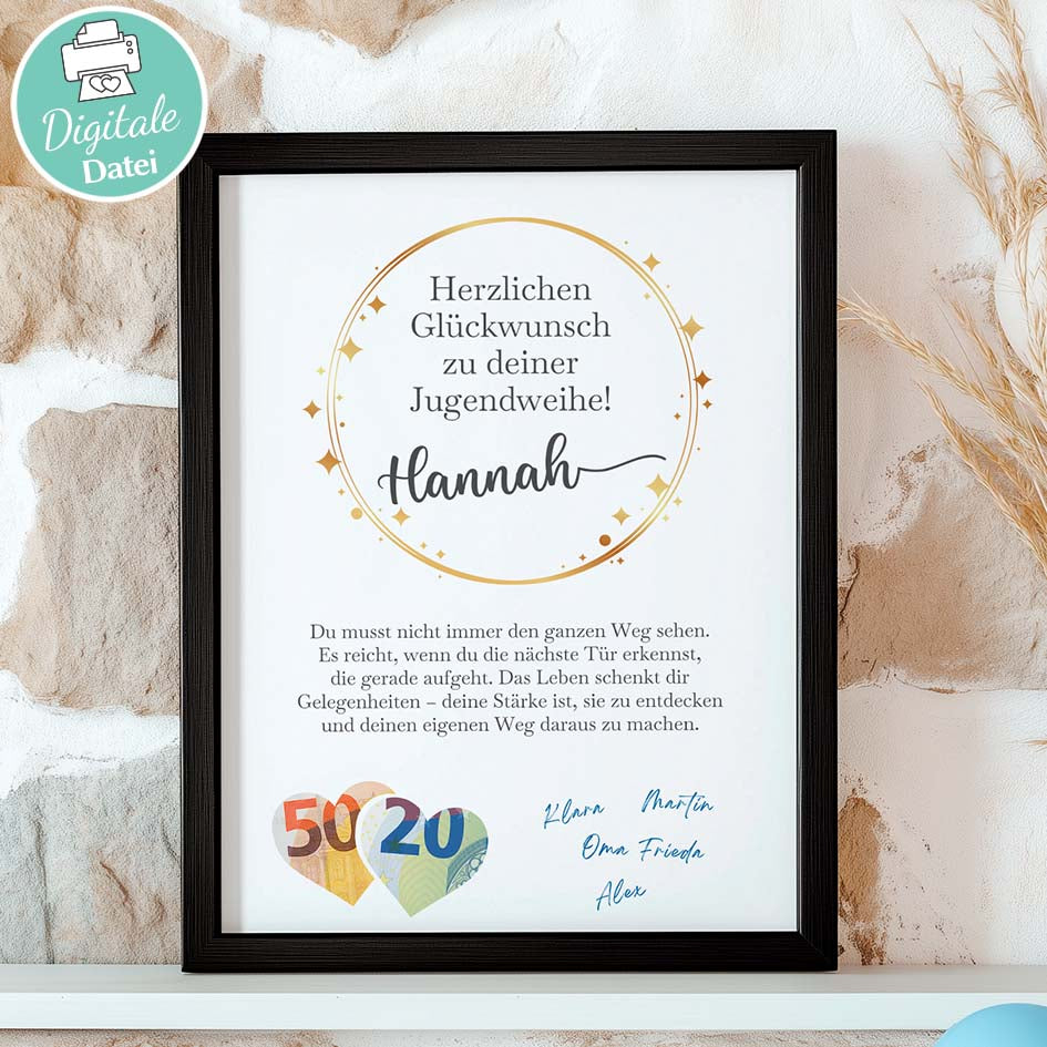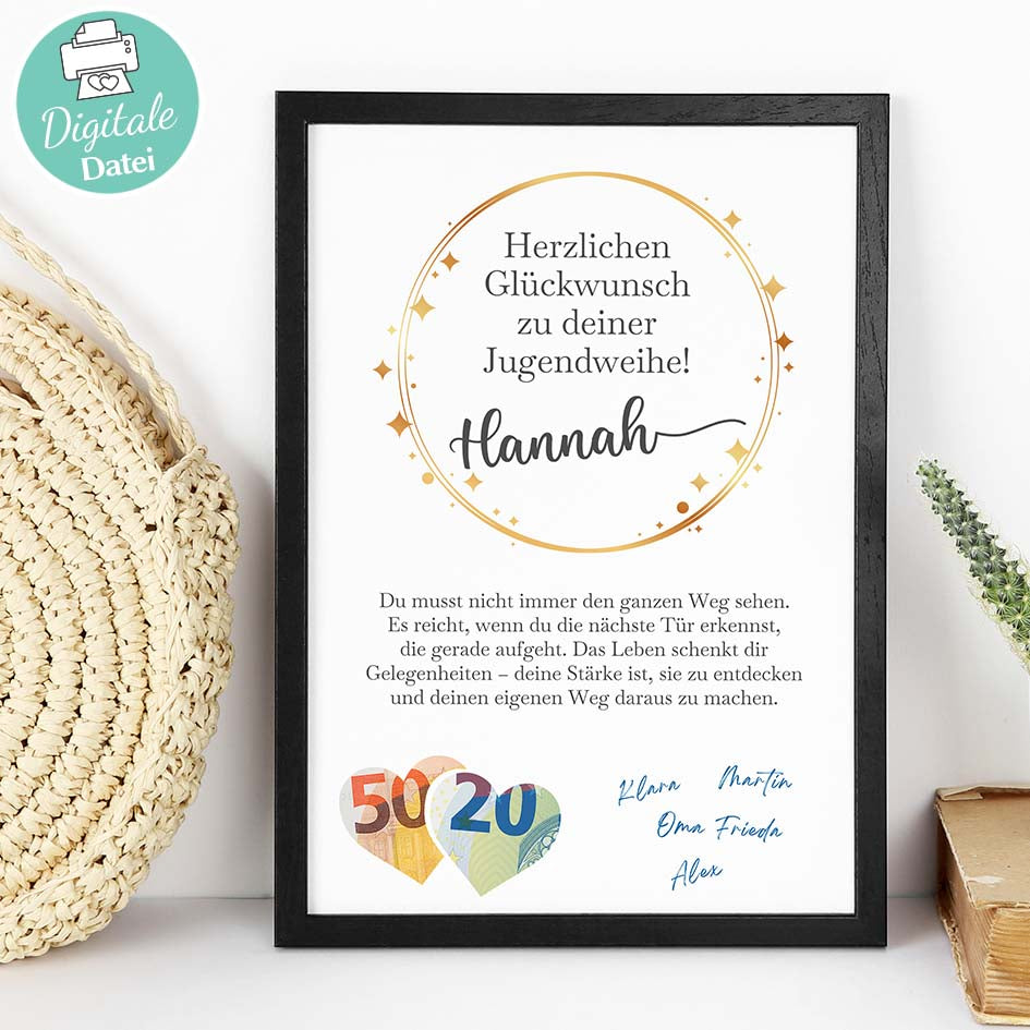 Einfach ausdrucken, ausschneiden, Geld dahinterlegen – und schon ist dein Geschenk zur Jugendweihe fertig!