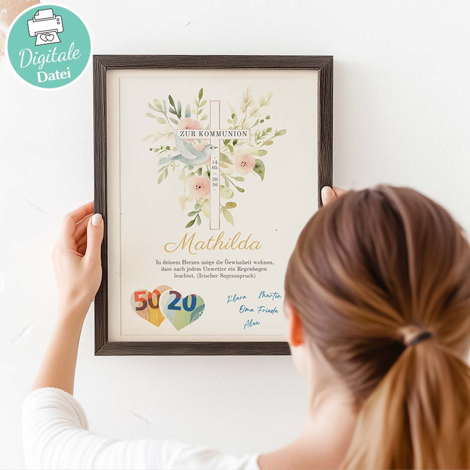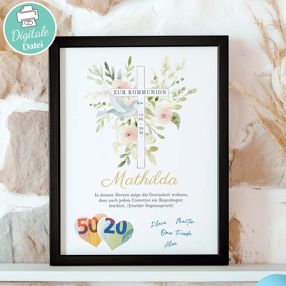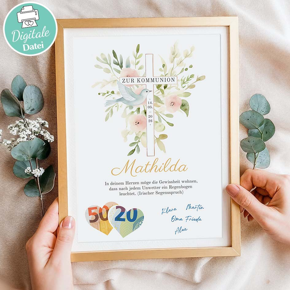 - 💶 Nach dem Ausschneiden der durch Schneidelinien gekennzeichneten Bereiche kannst du einen Geldbetrag dahinterlegen. Das fertige Poster passt perfekt in jeden handelsüblichen Bilderrahmen und ist ein liebevolles, symbolisches Geschenk zur Kommunion. ✝️